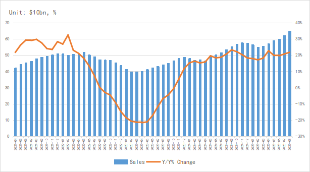 market sales reached $64.88 billion in August, representing a year-on-year (YoY) growth of 21.7%. This marks the 16th consecutive month that the YoY growth rate has exceeded 17%, continuing the strong growth momentum.