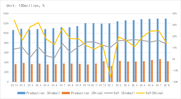 In terms of integrated circuit (IC) output, the global and China's IC output in August reached 129.5 billion units and 42.50 billion units respectively, with stable year-on-year (YoY) growth.