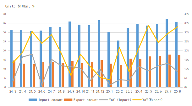 In terms of import and export, China's integrated circuit (IC) exports continued their strong growth in August, marking the 5th consecutive month with a growth rate exceeding 21%.