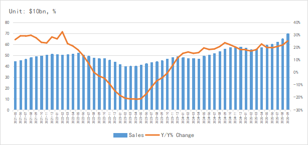 According to the latest data from the SIA, the global semiconductor market sales reached $69.47 billion in September, representing a year-on-year (YoY) growth of 25.1%. This marks the 17th consecutive month that the YoY growth rate has exceeded 17%, and the growth rate in the third quarter (Q3) was significantly higher than that in the second quarter (Q2).