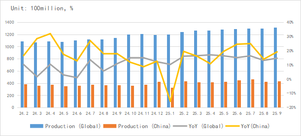 In terms of integrated circuit (IC) output, the global and Chinese IC output in September reached 131.3 billion units and 4.371 billion units respectively, maintaining stable growth.