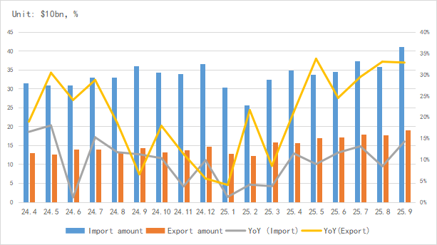 Regarding import and export, China's IC exports continued to register strong growth in September, with an average monthly growth rate exceeding 30% over the past five months.