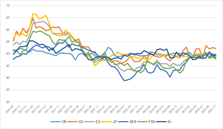 In November, the global manufacturing PMI declined slightly, and the recovery momentum of major economies remained relatively weak. Except for the United States, the PMIs of China, Germany, France, South Korea and Japan were all below the boom-bust line. Notably, the EU manufacturing PMI unexpectedly fell back below the boom-bust line, with manufacturing sectors in both Germany and France deteriorating.