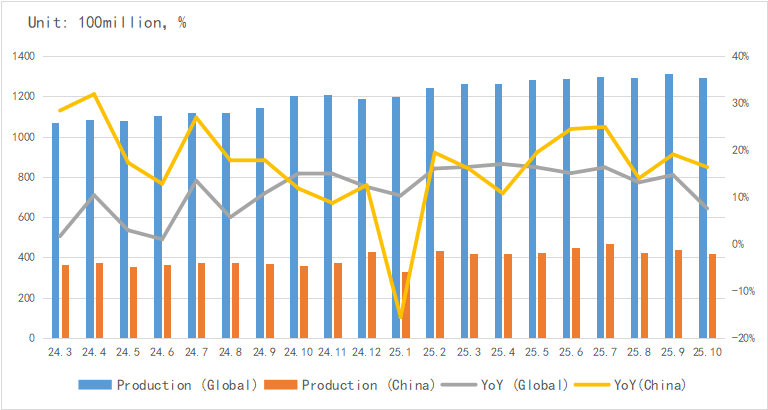 From the perspective of integrated circuit (IC) output, the global and Chinese IC output in October reached 129.6 billion units and 41.73 billion units respectively, showing a slight fluctuation.