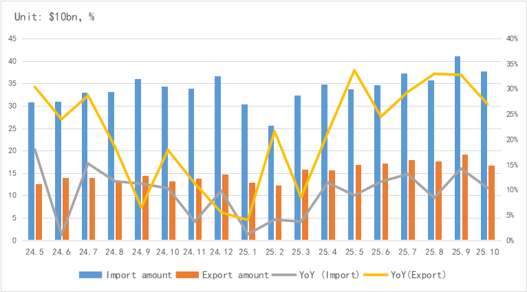 In terms of import and export, China's IC exports maintained strong growth in October, with an average monthly growth rate of over 30% in the past five months.