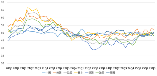 图表 1:2025Q3全球主要经济体制造业PMI