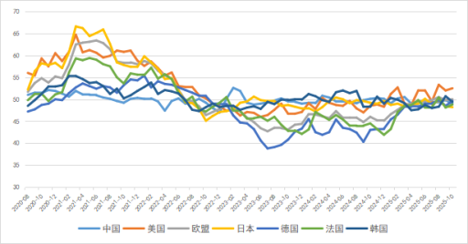 10月,全球制造业PMI波动持续,各国/地区经济表现呈现出显著分化。除美国,中国、法国、韩国及日本均有所下跌。其中,欧盟地区经历超三年的持续收缩后止跌企稳,但未能实现增长,需求增长乏力。