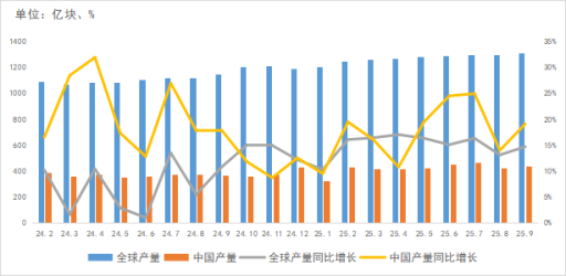 从集成电路产量看,9月全球及中国集成电路产量分别为1313亿块、437.1亿块,增长稳定。